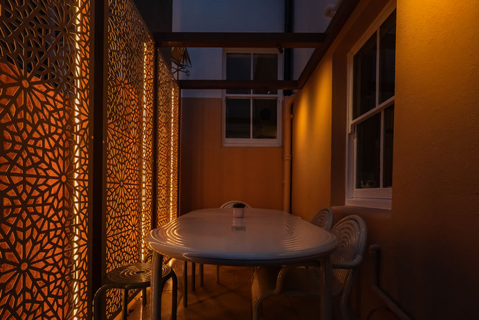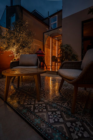 A compact Brighton courtyard transformed into a calm, inviting evening space through subtle focal lighting and restrained illumination.